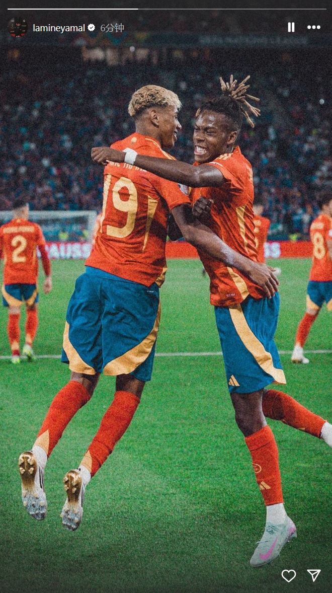 直播吧6月14日讯 巴萨边锋亚马尔更新了社媒,晒出了一张与尼科在国家队比赛中的庆祝照片。